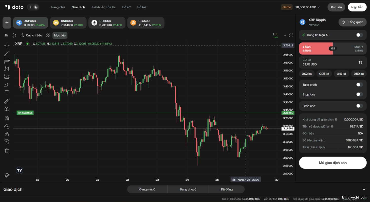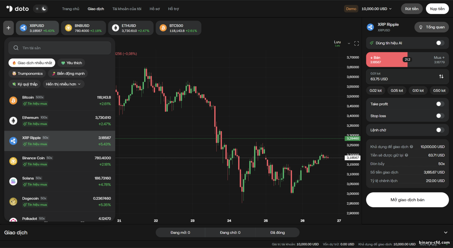 Tất cả chỉ vậy—mở tài khoản Doto thực sự đơn giản. Trải nghiệm cá nhân: đăng ký, xác minh và nạp tiền mất khoảng một ngày (giai đoạn duyệt giấy tờ lâu nhất) và tôi đặt lệnh live đầu tiên vào ngày hôm sau. Doto đôi khi có khuyến mãi hỗ trợ người mới—ví dụ bonus nạp đầu (tới 50 %), song thường cần đạt ngưỡng khối lượng mới rút được bonus. Tài khoản demo được mở sẵn khi đăng ký, nên bạn có thể giao dịch ảo ngay, không giấy tờ.