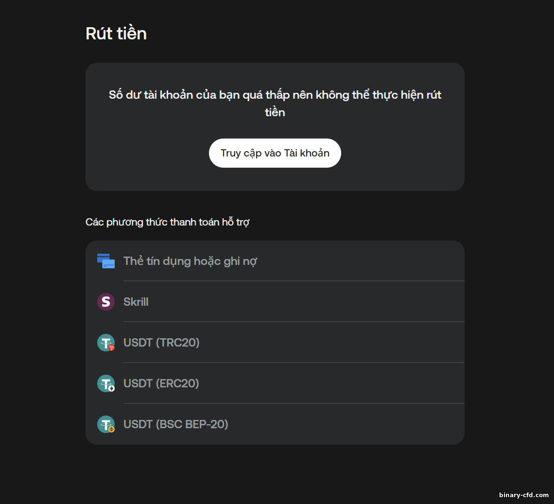 - Nạp tiền. Để bắt đầu giao dịch live, hãy nạp tiền. Tối thiểu 15 USD—thẻ ngân hàng cũng hỗ trợ mức nhỏ này. Chọn phương thức (thẻ, ví điện tử, crypto—chi tiết ở phần kế) và làm theo hướng dẫn. Phần lớn phương thức ghi có ngay hoặc trong 15 phút. Sau khi nạp, số dư hiển thị và bạn có thể giao dịch.