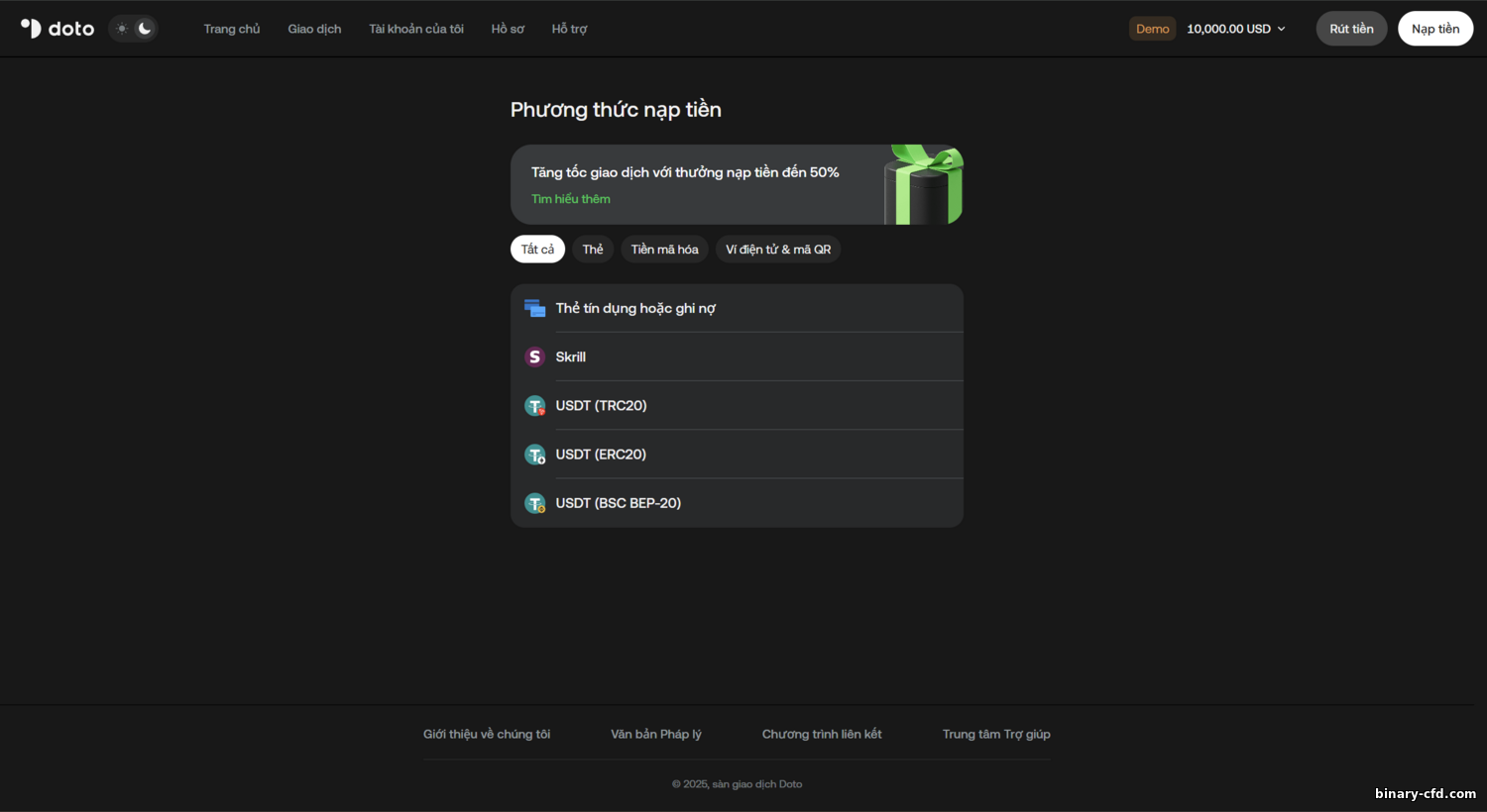 Lưu ý quan trọng: Giống mọi broker được quản lý, Doto yêu cầu phương thức nạp/rút thuộc về chính bạn. Chỉ dùng thẻ và ví mang tên bạn—tên phải trùng thông tin hồ sơ Doto. Quy tắc an toàn này ngăn rửa tiền và bảo vệ bạn khỏi việc chi trả cho bên thứ ba.