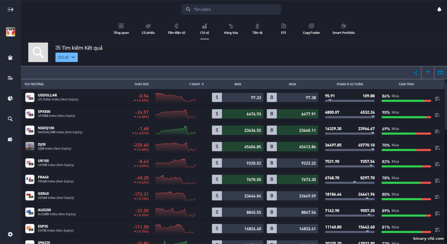 Khoảng 13 chỉ số chứng khoán lớn toàn cầu khả dụng qua CFD, gồm US500 (S&P 500), US100 (Nasdaq 100), DJ30 (Dow Jones), GER40 (DAX), UK100 (FTSE 100), JP225 (Nikkei) và các chỉ số khác. Spread ở mức vừa phải: S&P 500 ~0,75 điểm, Dow Jones ~6 điểm, DAX ~2 điểm. Đòn bẩy với chỉ số CFD tới 1:20. Chỉ số phù hợp với người thích giao dịch thị trường rộng thay vì chọn từng cổ phiếu.