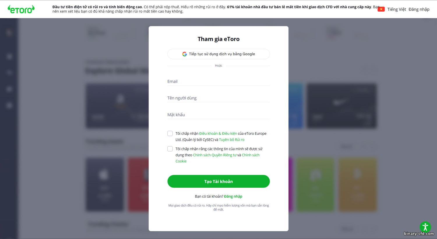 - Đăng ký trên nền tảng. Truy cập trang chính thức của eToro và nhấn “Join Now.” Nhập email và tạo mật khẩu, hoặc đăng ký nhanh qua Google hay Facebook. Chấp nhận điều khoản để vào bảng điều khiển.