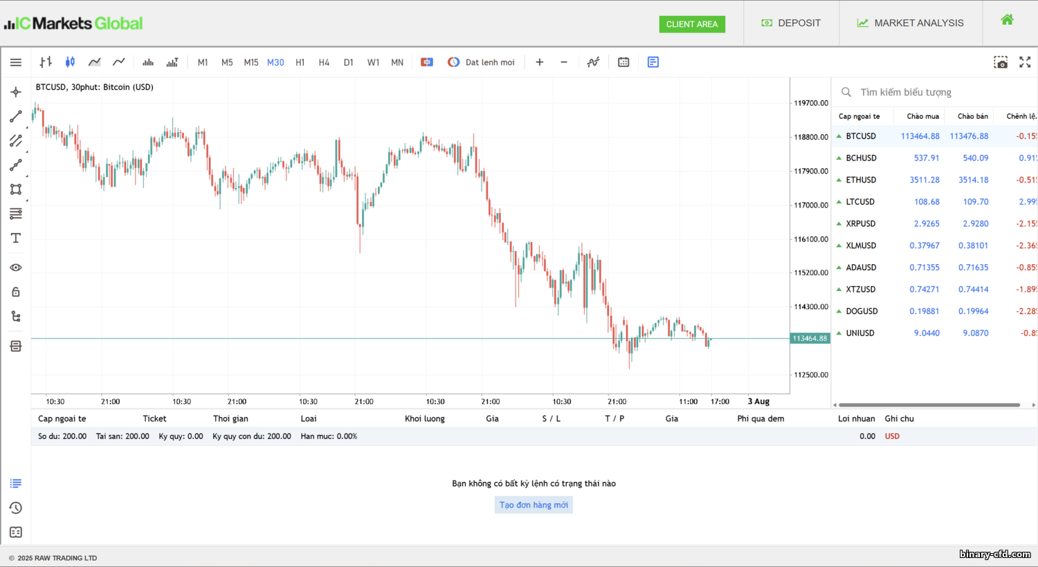 Bắt kịp xu hướng, IC Markets cung cấp giao dịch crypto. Danh sách gồm 10–20 cặp — các coin chính như BTC/USD, ETH/USD, LTC/USD, XRP/USD và altcoin khác. Crypto giao dịch dạng CFD, 24/7.
