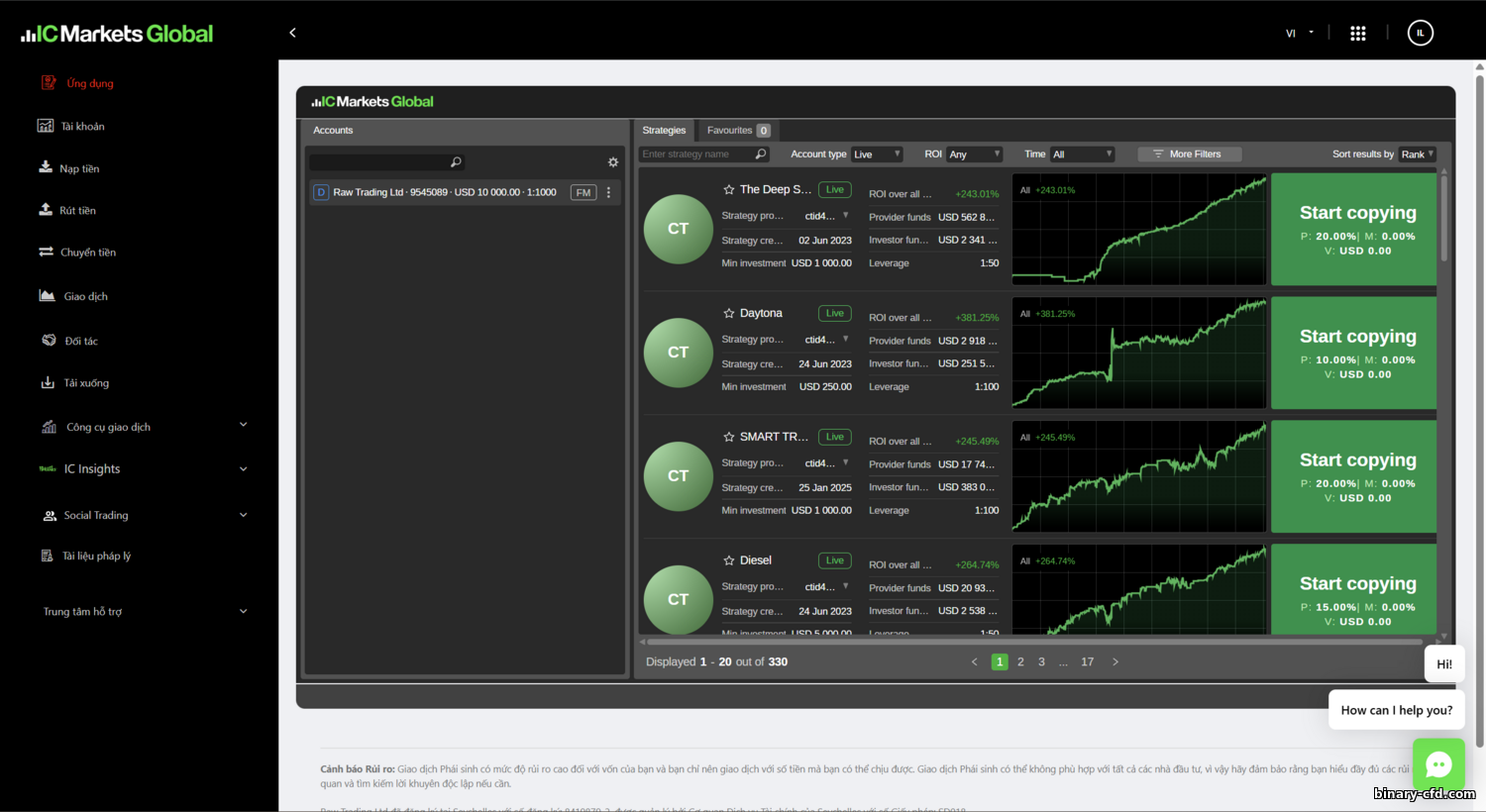 - IC Social — ứng dụng di động riêng cho giao dịch xã hội. Trader giàu kinh nghiệm có thể làm “nhà cung cấp tín hiệu”, người mới đăng ký theo dõi. Bạn xem xếp hạng, hiệu suất, rủi ro rồi auto‑copy lệnh vào tài khoản. Sao chép diễn ra tức thì trong hệ sinh thái IC Markets, giảm trượt giá. Cách đơn giản cho người thích theo chuyên gia. Nhà cung cấp được trả phí minh bạch qua phí cố định hoặc chia lợi nhuận.
