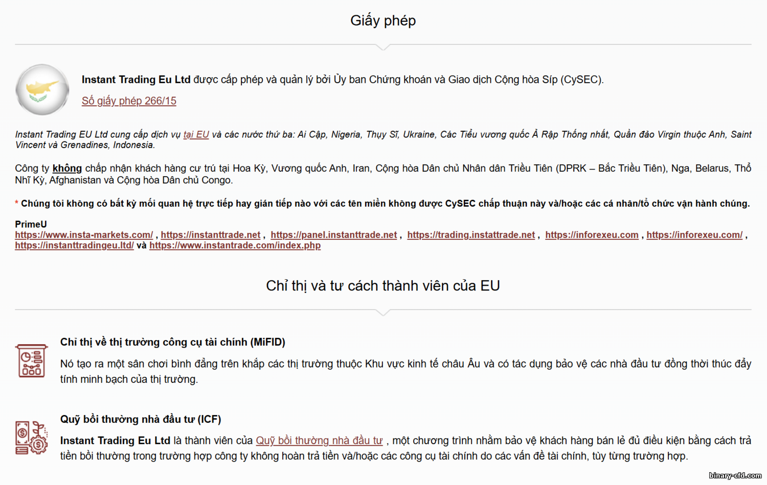 Instaforex đăng ký offshore: thương hiệu cốt lõi thuộc Instant Trading Ltd, được cấp phép tại Quần đảo Virgin thuộc Anh (BVI FSC, số SIBA/L/14/1082). Đối với khách hàng châu Âu, công ty con Instant Trading EU Ltd nắm giấy phép CySEC (Síp) số 266/15. Tuy nhiên, sàn không có giấy phép hàng đầu như FCA (Anh) hoặc ASIC (Úc). Cũng không có giấy phép từ Ngân hàng Nga, nên Instaforex không chịu giám sát chính thức của cơ quan này. Trên thực tế, phần lớn khách hàng giao dịch qua pháp nhân offshore tại BVI, nơi yêu cầu nới lỏng hơn nhiều so với EU hay Mỹ.