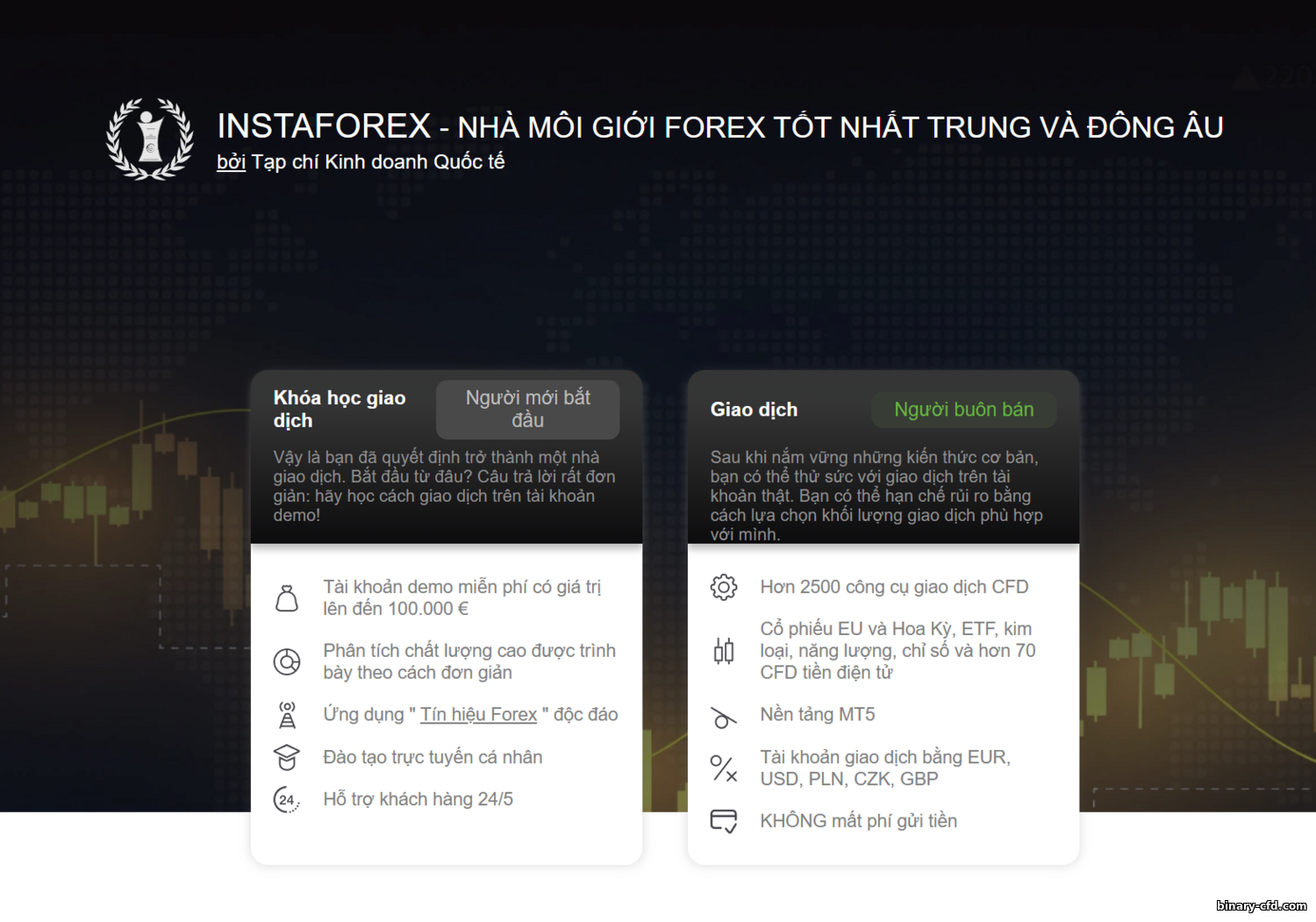 Instaforex là một nhà môi giới forex quốc tế ra mắt năm 2007 bởi tập đoàn InstaFintech. Qua nhiều năm, sàn đã thu hút hàng triệu khách hàng trên toàn thế giới—chính công ty tuyên bố có hơn 7.000.000 trader từ nhiều quốc gia. Instaforex hoạt động đặc biệt mạnh ở châu Âu và châu Á: có văn phòng tại 260 thành phố, nhiều ở các nước châu Á. Tại Nga, trụ sở đặt ở Kaliningrad, cùng mạng lưới văn phòng đại diện và đối tác trên khắp CIS, châu Âu và châu Á. Instaforex nổi tiếng với chiến lược quảng bá mạnh: là nhà tài trợ chính thức của Liverpool FC và đội đua Loprais, và từng có đại sứ thương hiệu là các ngôi sao thể thao như huyền thoại biathlon Ole Einar Bjørndalen. Sàn đã nhận nhiều giải thưởng trong ngành, bao gồm từ CNBC Business Magazine và European CEO, và thường được vinh danh “Best Broker in Asia”.