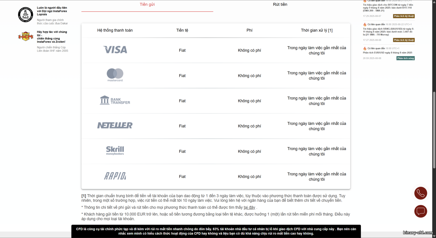 - Tín hiệu & phân tích. Trong MT4/MT5, khách có thể đăng ký MetaTrader Signals (copy trả phí). Instaforex không hạn chế. Trang web cũng đăng tín hiệu miễn phí (dự báo, mức mỗi ngày). Bạn có thể cài cảnh báo email trong khu vực khách hàng. Tín hiệu không đảm bảo lợi nhuận—hãy tỉnh táo. Instaforex nhấn mạnh học tập với nhiều nội dung phân tích.