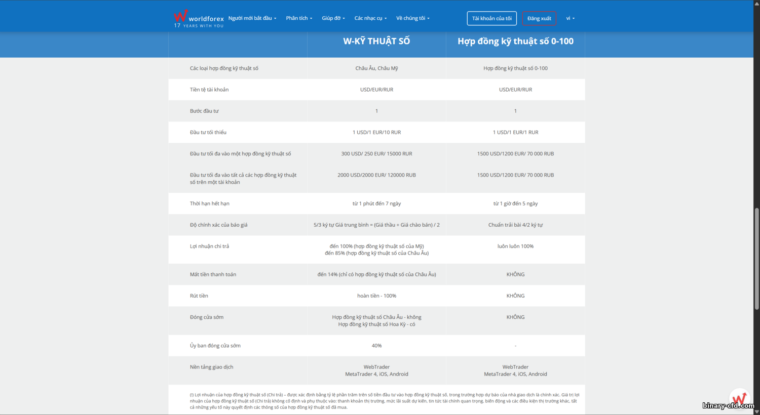 | W-DIGITAL | Cố định, ~1,8 pip (thị trường cơ sở) | 40% (khi thoát sớm) | Tài khoản quyền chọn nhị phân. Mức cược từ $1, lợi nhuận tối đa 100% tiền cược. Phí áp dụng khi mua lại sớm (~40% được hoàn). |