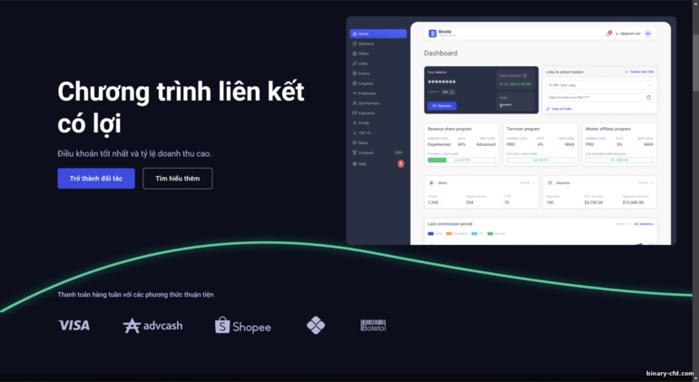 Binolla tự giới thiệu như một nền tảng giao dịch tùy chọn kỹ thuật số thân thiện với người dùng. Chương trình liên kết của họ có thể mang lại hoa hồng đáng kể (lên đến 80%), dù thỉnh thoảng vẫn có phản ánh về việc chậm chi trả, đặc biệt khi có đợt quảng bá quy mô lớn. https://partners.binolla.com/